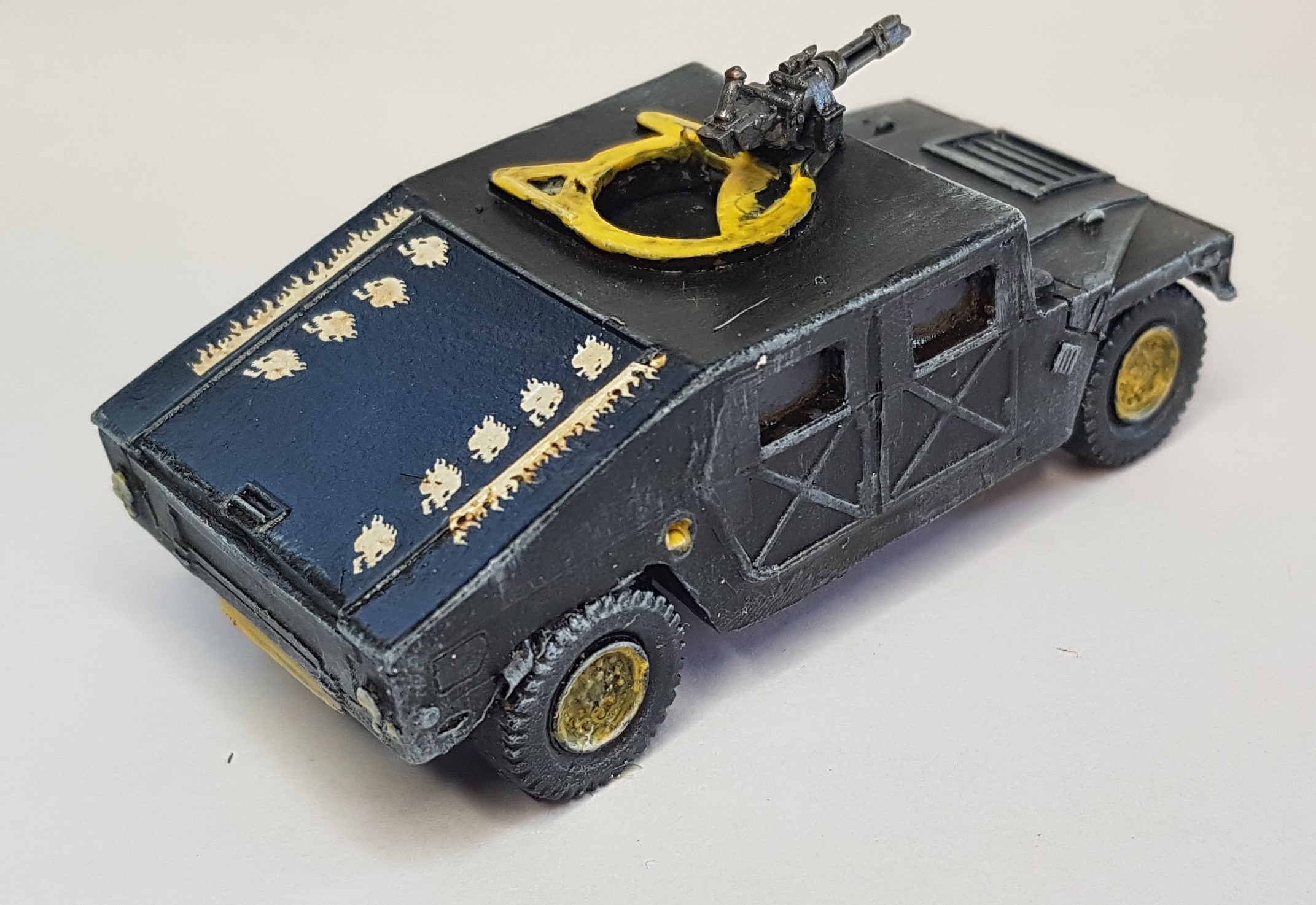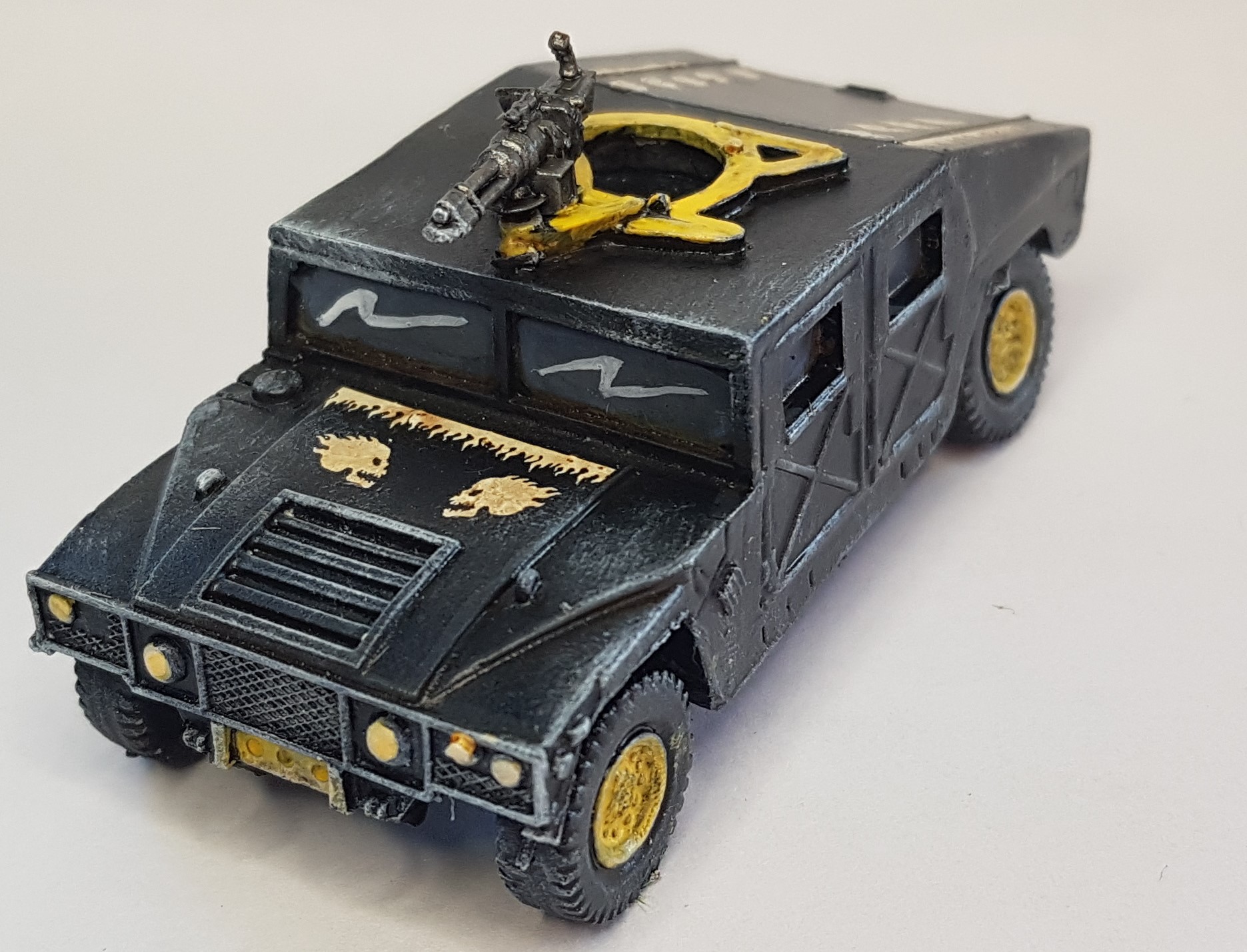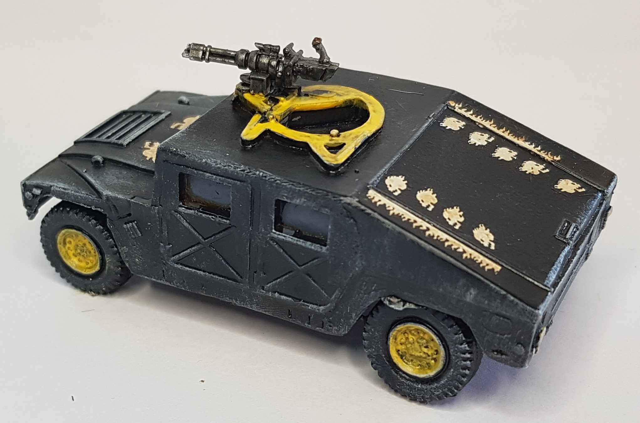 So first up the Special Ops insertion vehicle – with the Biker bosses Minigun as weapon, some transfers left over from Bloodbowl sets, painted up as one of the those Black Hmmvees that all good zombie films/series have at some point.
