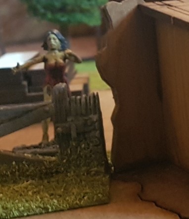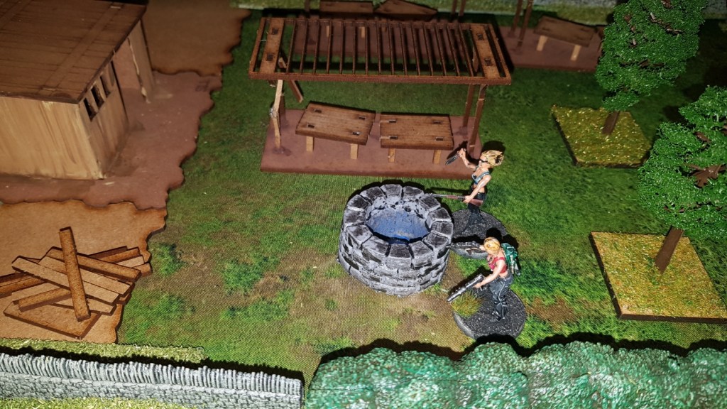 Leccy has 6 Ap, she loses 2AP due to the supply pack she is carrying so has 4AP – now Annie the zombie can move 5″ a turn and is 3″ away from Leccy, Leccy moves 4 ap towards the wall, trying to keep out of sight of Annie and Flat eric.