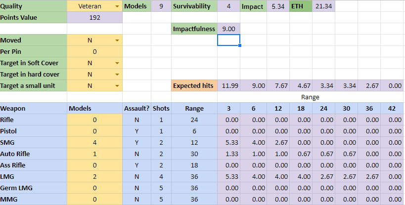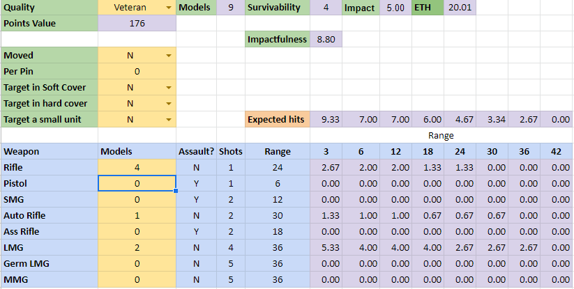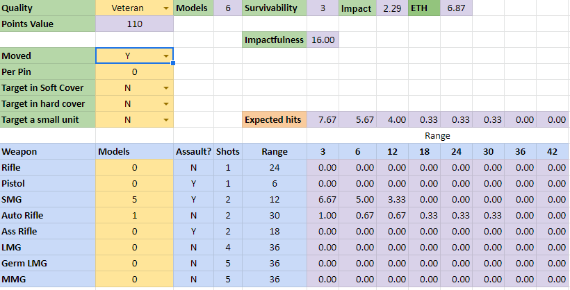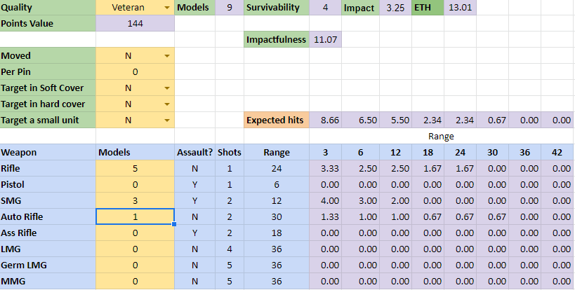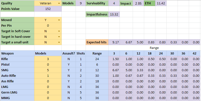 So lets go back to the original recommended squad – that was 5 rifles, 3 SMG and a BAR – but this time we are going to change the Moved marker to Y.. The IMPACTFULNESS score for this was 11.07 with out the impact of moving – its now 14.52.