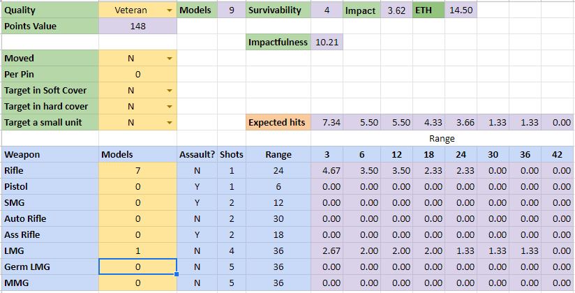 So after a load of number crunching and making the model work for movement, and assuming an equal weighting for moving and static – it looks like the 4 SMG, 1 BAR and 2 LMG is the best followed by 4 Rifles, 1 BAR and 2 LMG, then 3 Rifles, 4 SMG and 1 LMG. What I currently can’t take into account is the benefit of an MMG.