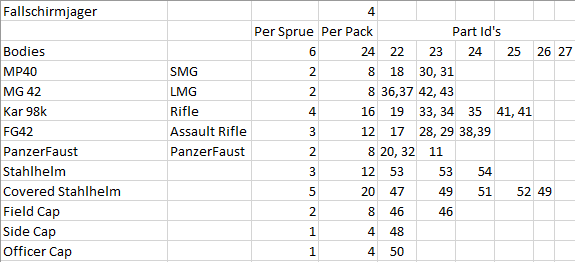 So more number crunching – this time I will be looking at mid war/late war Fallschirmjäger. I have 4 sprues of Fallschirmjäger to turn into squads and enable me to field an improved Mid war/Late war Fallschirmjäger force when added to those I built earlier.
