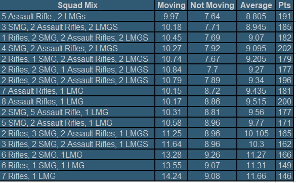 The first is 8 Assault Rifles and 1 LMG team – this has an EFFECTIVENESS score of 8.86 static and 10.17 moving.
