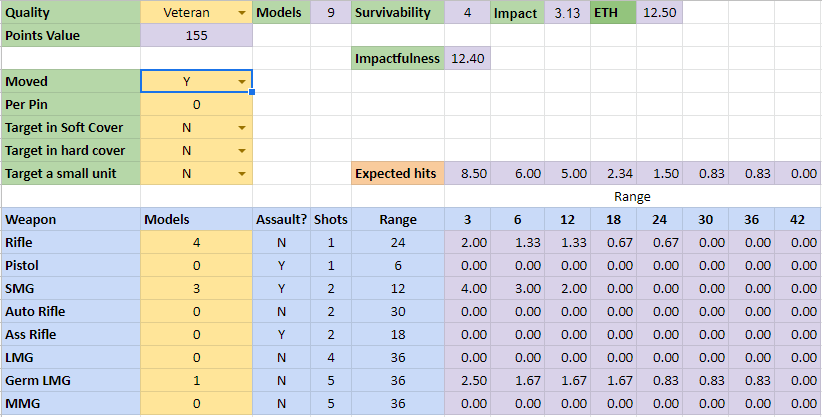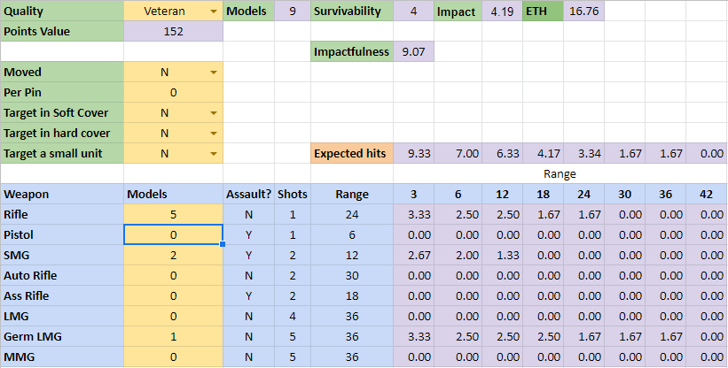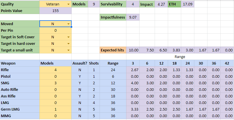 Now lets optimise the early war forces. Looking at the mix of options I have previously done – one seems missing- that is 5 Riflemen, 2 SMGs and 1 LMG a classic 9 man team – its EFFECTIVENESS is 9.07 static and 12.94 moving