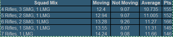 The Second is 2 SMG, 1 LMG team and 6 Rifles – this has an EFFECTIVENESS score of 9.26 static and 13.28 moving.