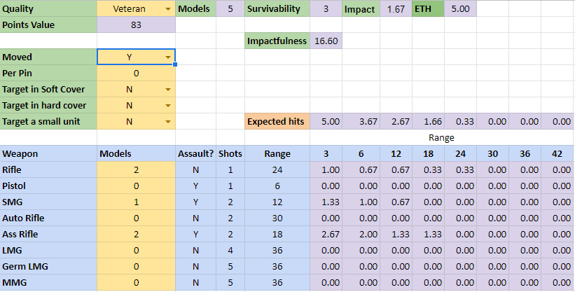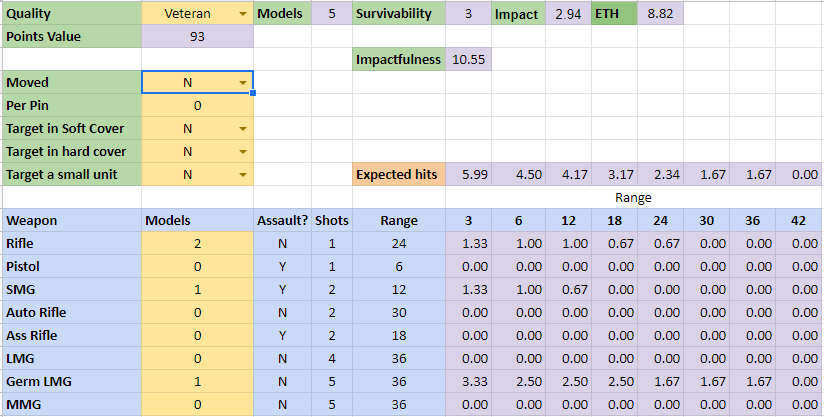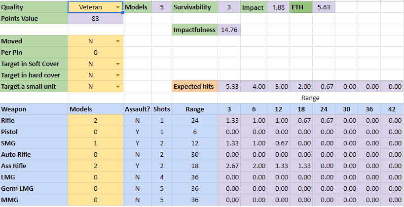 Now I have identified a slight issue with my comparison method – that is when using it to create lists – the fact that a lower score signifies better EFFECTIVENESS if you try to add the effectiveness scores together to calculate the most EFFECTIVE list it does not take in to account that you can only create a single pin per unit – and having 2 units fire on a single target and create 2 pins may actually be more impactful in the game than a single unit causing 1 pin and some fatalities.