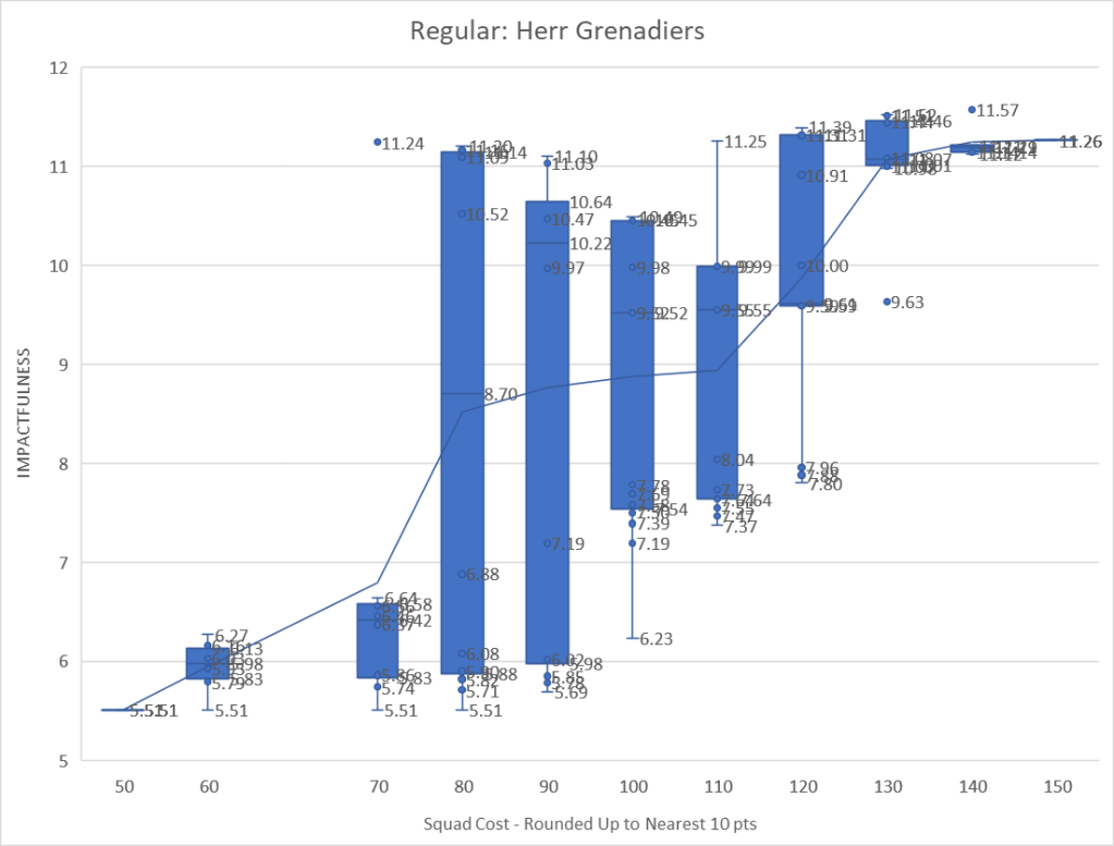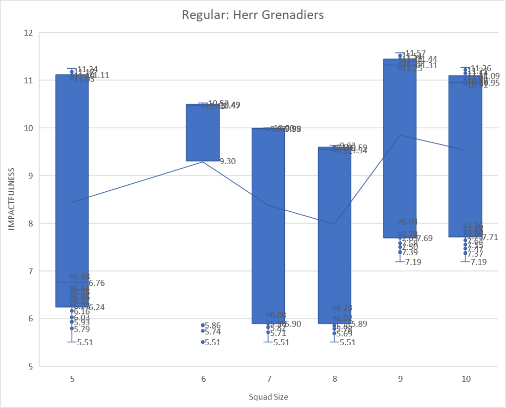 OK lets hit the figures.. what are our options – now we can either have Regular or Veteran squads, my IMPACTFULNESS calculator does seem to suggest Regular are better value – now is that true if we try multiple smaller units over a few large units.