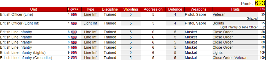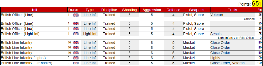 This Battalion has a Shako and Bayonets force value of 623 – I have included the officers into the Lights and Grenadiers companies and left the Officer and colour party as basic figures for the centre company, thus this force would have only 2 command points.