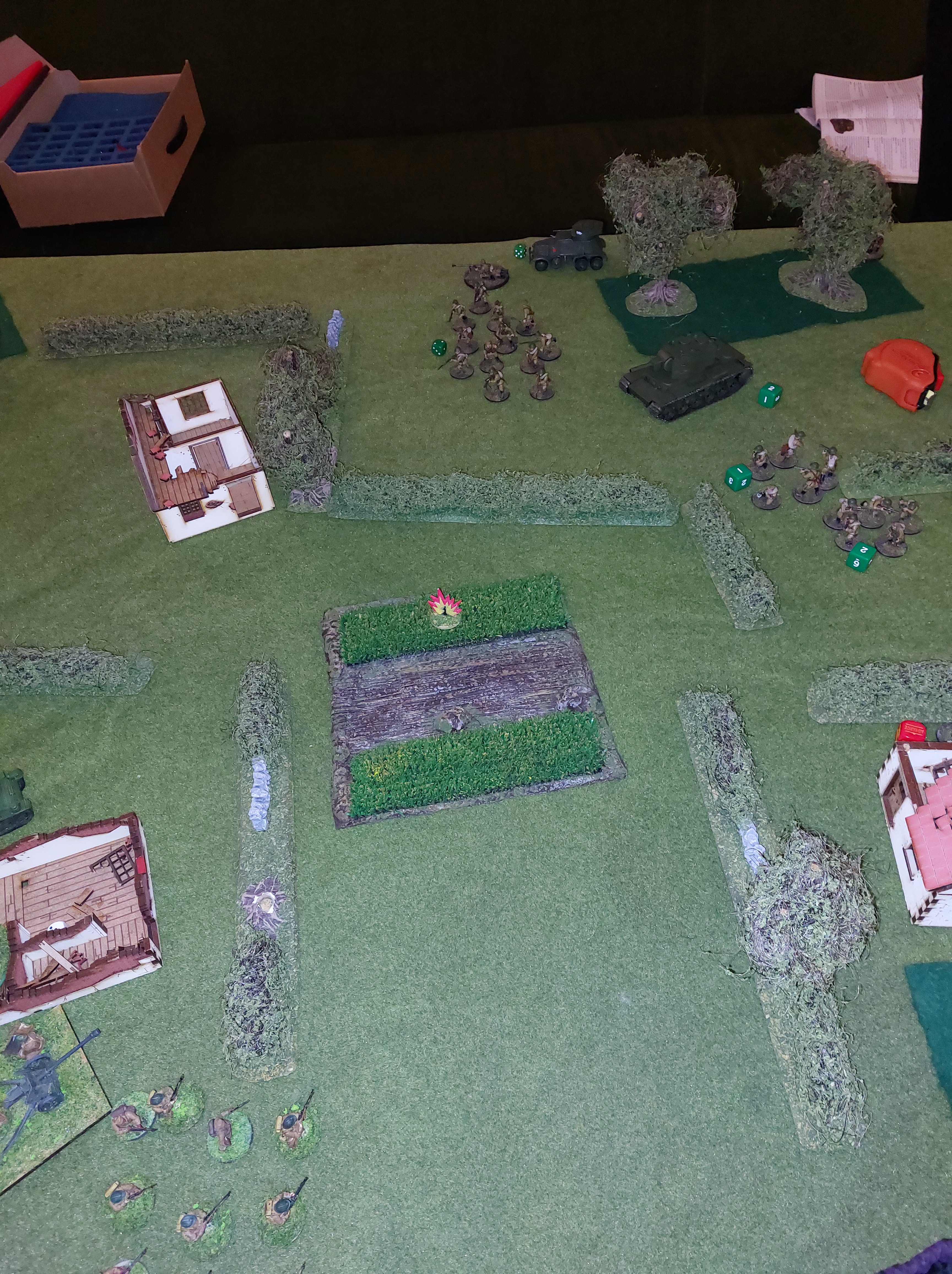 The russians green troops lost a single figure to the French AT rifle and leveled to regular immediately making their Commissar redundant. On the far left another french rifle squad occupied a second ruined house but then came under fire from the Russian Mortar squad and failed to activate for the rest of the game.