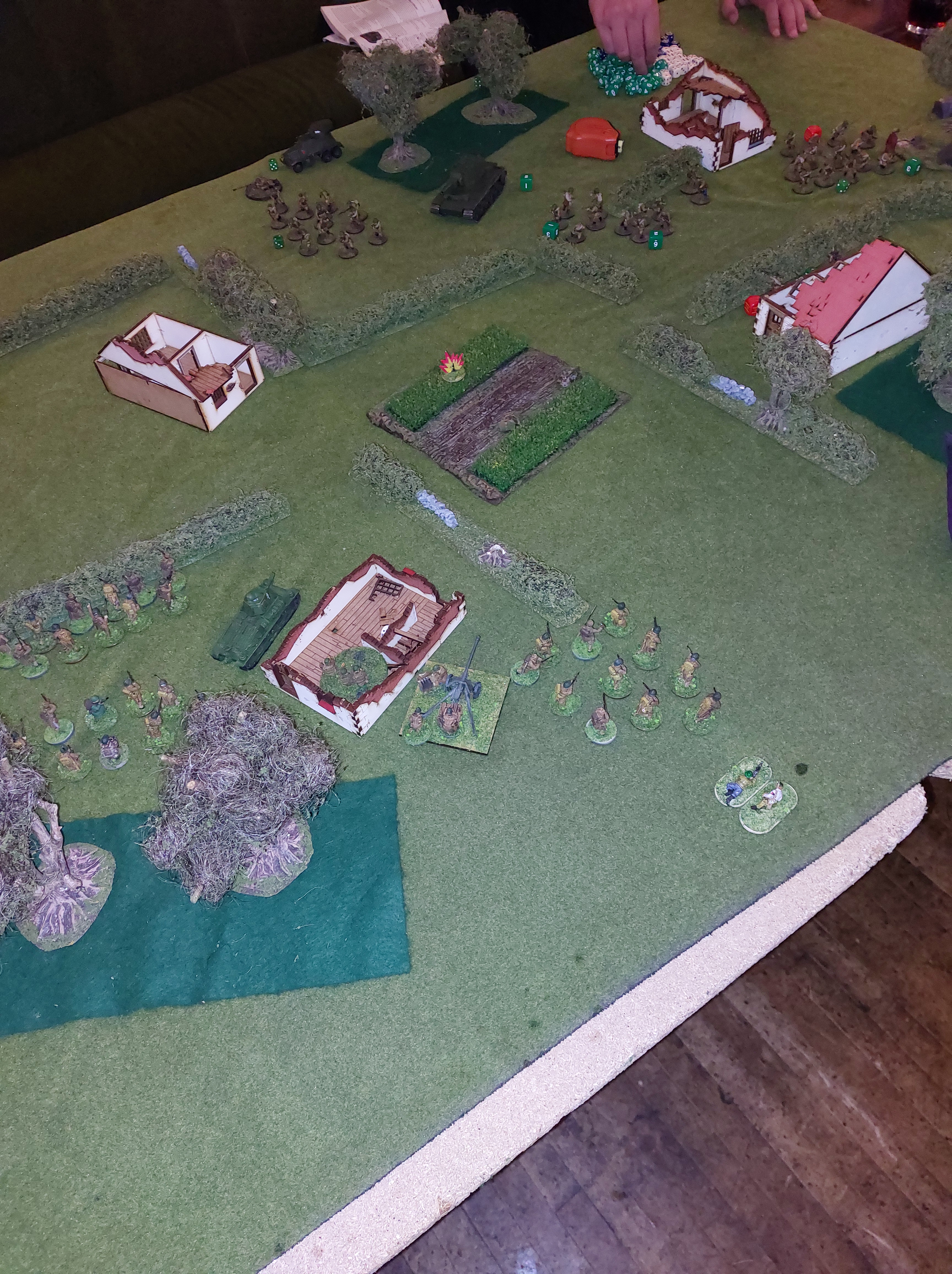 Turn 5 began with the rifle squad that I hoped to assault moving forward and out of line of sight from my unit, they also fired at my LMG bike and took it out, he reversed his Tractor unit backwards away from my forces and tried to kill my AT rifle motorbike with his artillery observer team. Fire was continued to be pumped into my unit in the field, and they collapsed and fled. The AT bike survived and followed the Tractor getting a shot off, which missed but did mean that at the end of turn my unit was closest to it so it was removed from the table. At this point I had my AT rifle. my at rifle bike and 1 Assault squad, whilst my opponent had only lost 3 of his initial 17 dice. So I conceded and congratulated him on a good game.