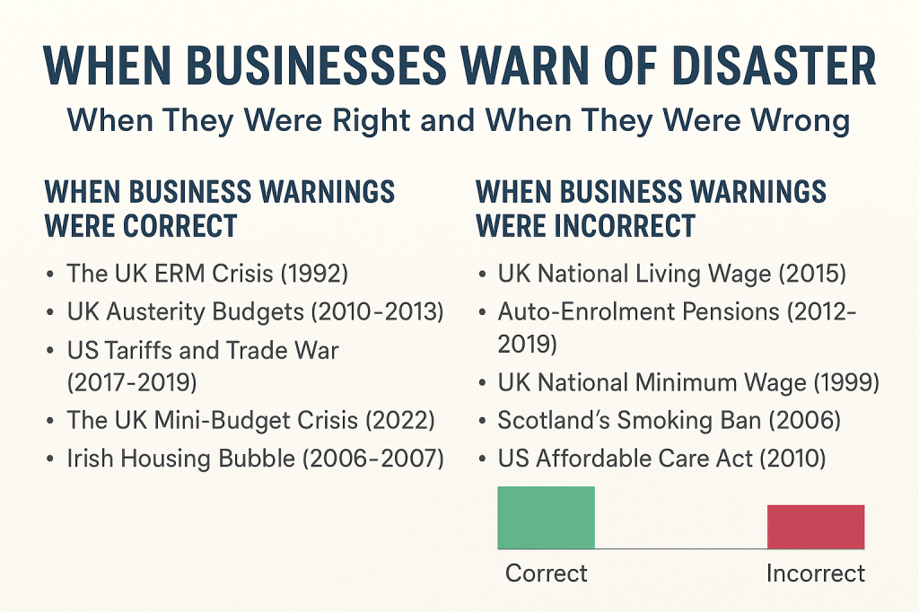 I’m going to compare some major examples where businesses warned of economic damage, identifying when they were right, when they were wrong, and which political party was responsible for the Budget or policy.