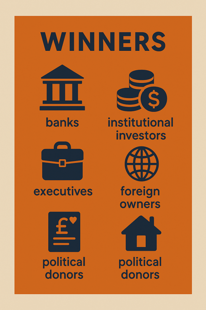 Meanwhile, foreign investment funds, private equity firms, and overseas state-owned utilities quietly bought up British companies — extracting profits while the public footed the bill for oversight.