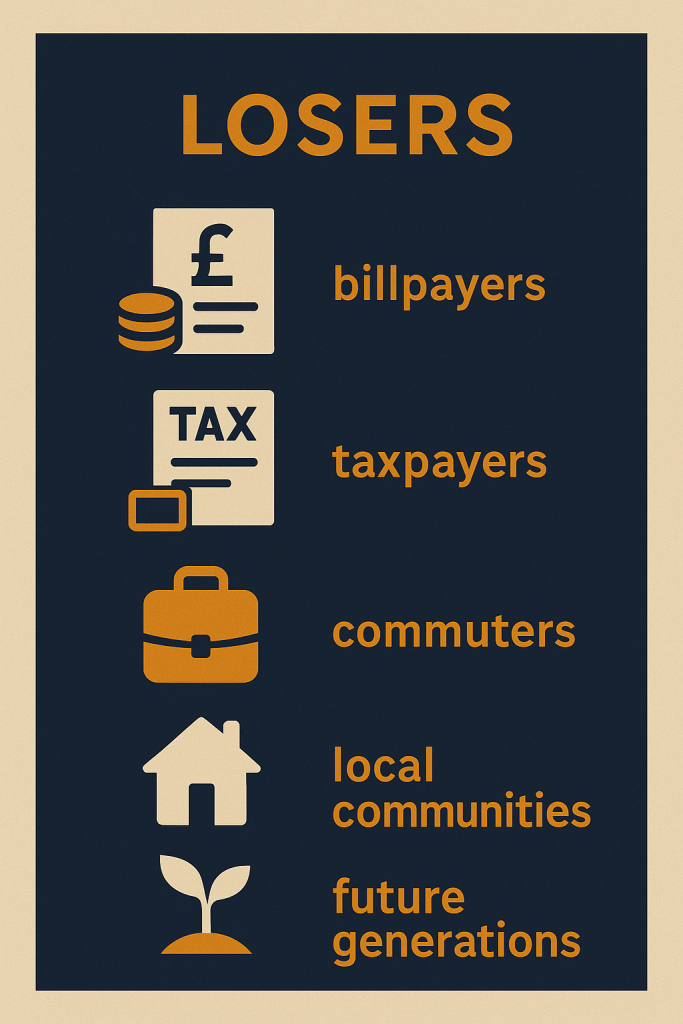It’s “Who actually benefited — and why did the public end up paying more for less?”