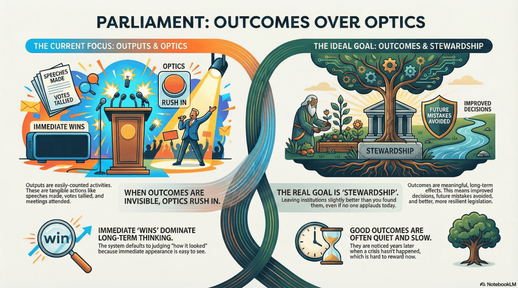 No one sat down and decided Parliament should reward optics over outcomes.