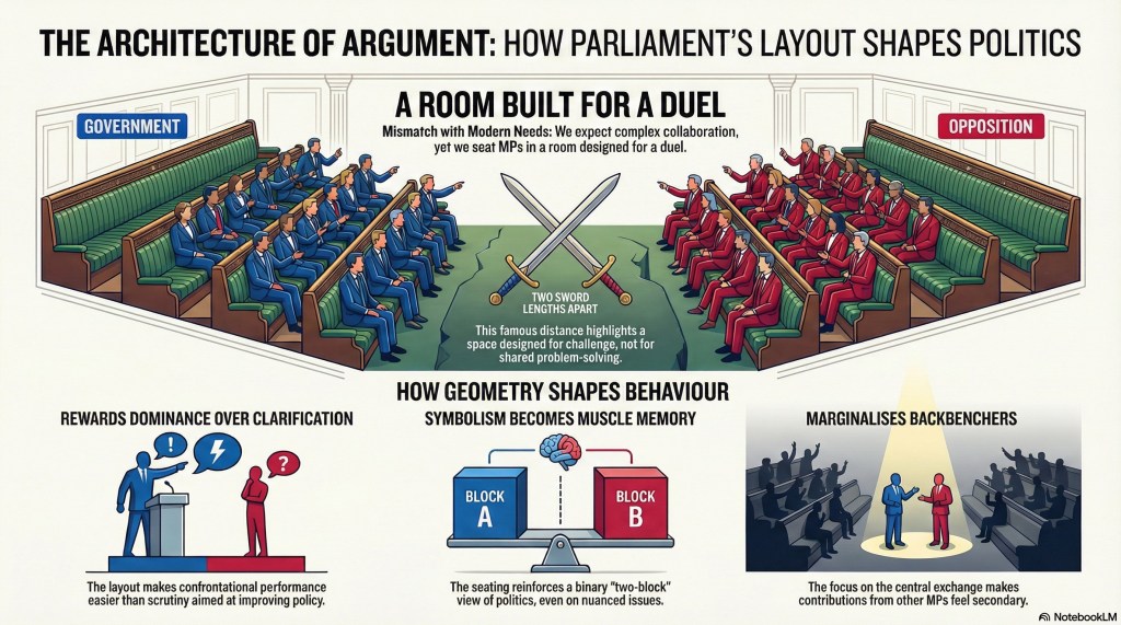 Cross-party agreement becomes something that has to work against the geometry of the space. Compromise starts to look awkward, even suspect, when the audience is arranged as rival camps.