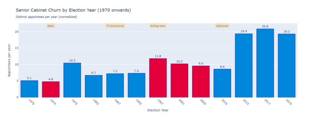 Chart 1: Senior Cabinet churn by election year — distinct appointees per year, normalised