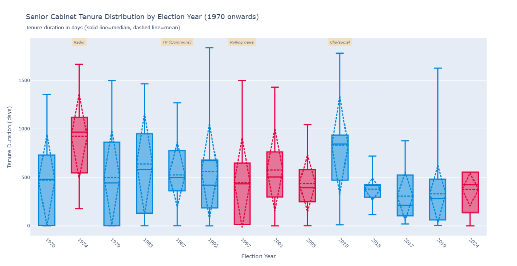 Chart 2: Senior Cabinet tenure distribution by election year — box/whiske