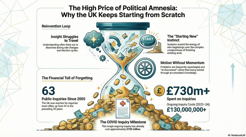 The Institute for Government notes that completed inquiries since 2005 have cost over £730m, and that in 2023–24 the direct cost of ongoing inquiries exceeded £130m (before we even count the extra spend by departments and public bodies responding to them).
