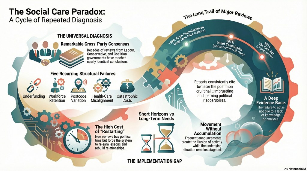 The details vary, the sequencing changes, and the political packaging shifts — but most reviews converge on familiar conclusions. Underfunding relative to demand. Postcode variation driven by local authority budgets. Workforce pay and retention problems. Poor alignment between health and social care. Fear of catastrophic costs delaying decisions. The need for more predictable, pooled funding.