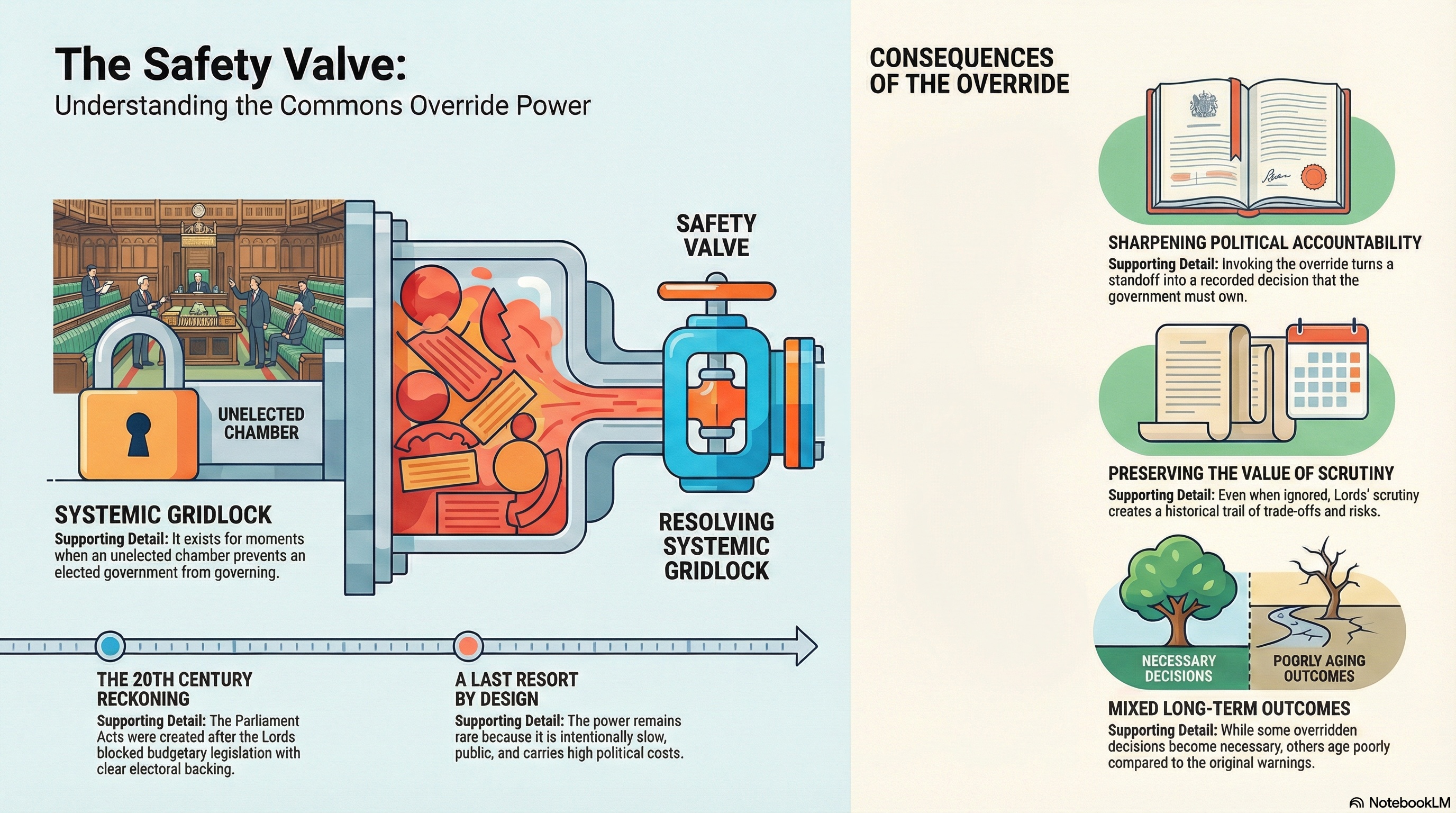 That episode matters because it explains the purpose of the override. It’s a safety valve. It exists for moments when an unelected chamber is preventing an elected one from governing at all.