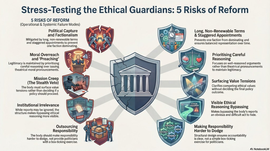 If you create a separate place for ethical reasoning, politicians might quietly outsource responsibility to it. “That’s their job now,” the thinking goes. “We’ve had the ethics report — box ticked.”