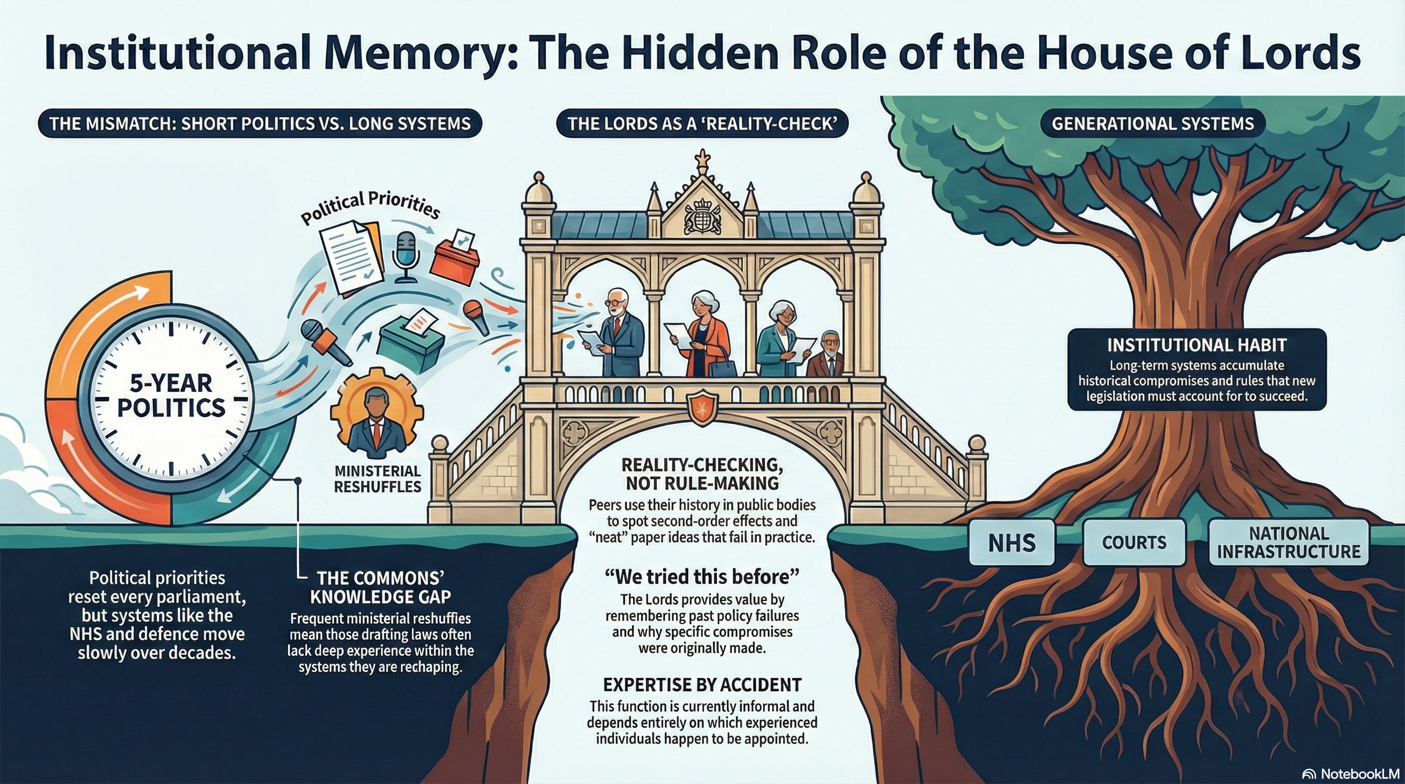 Former health ministers. People who’ve run large public bodies. Senior figures from the courts, defence, policing, social care, infrastructure. They tend to end up in the Lords because those systems don’t reset every five years, even though politics does.